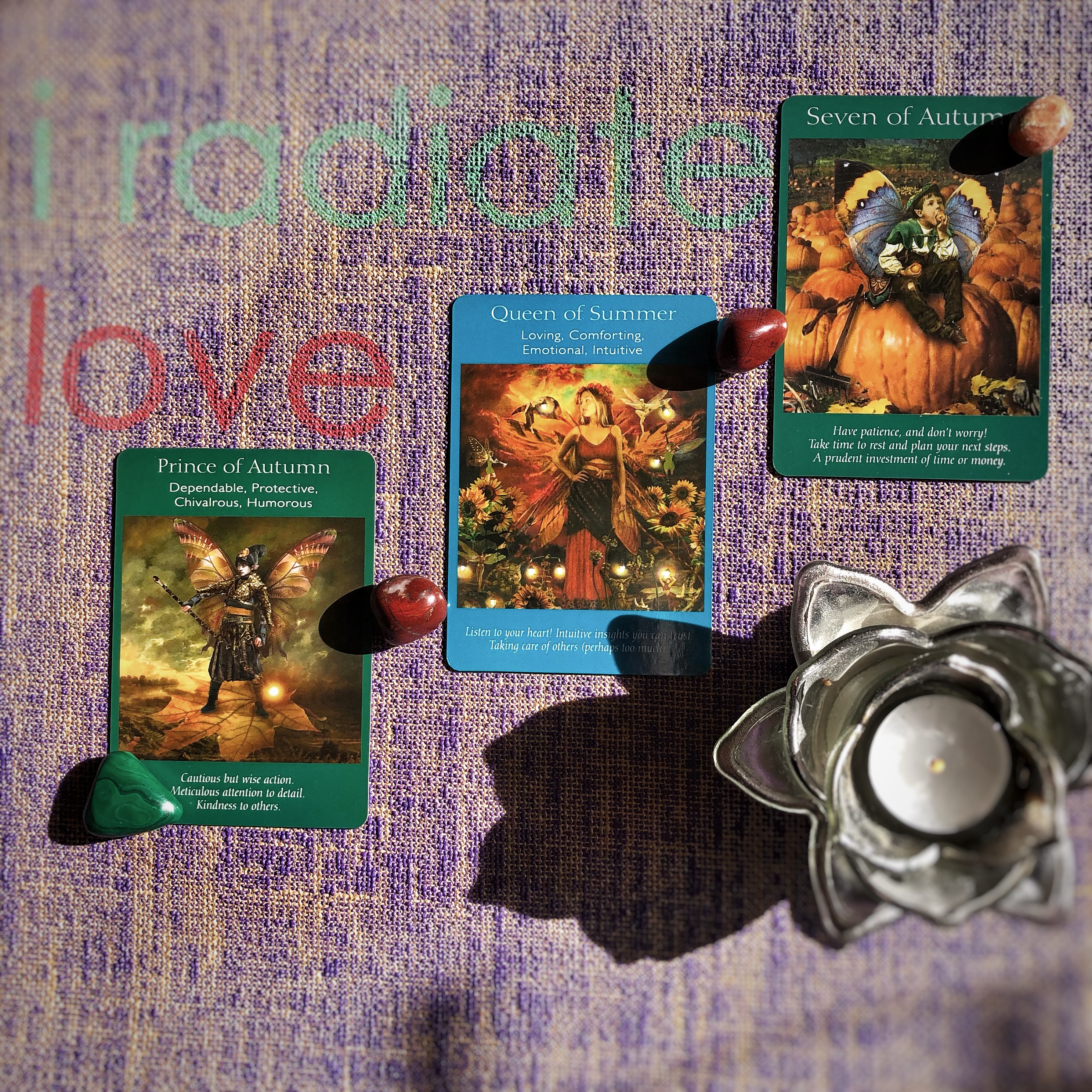 Authors note: This weeks cards are using the stepping stones spread and read from left to right. The 1st card - Prince of Autumn, is where we are standing and what’s in the forefront of our mind. The 2nd card - Queen of Summer, is the next step, or action we need to take. The 3rd card - Seven of Autumn is where we’ll likely end up if we follow card 2.