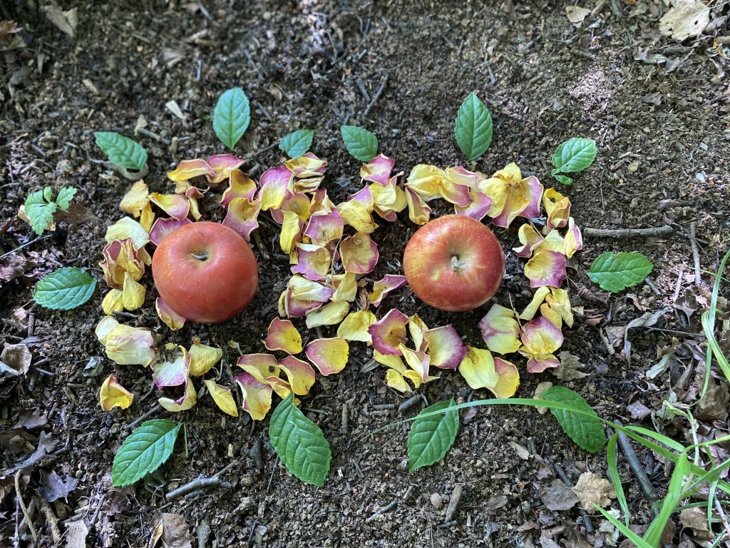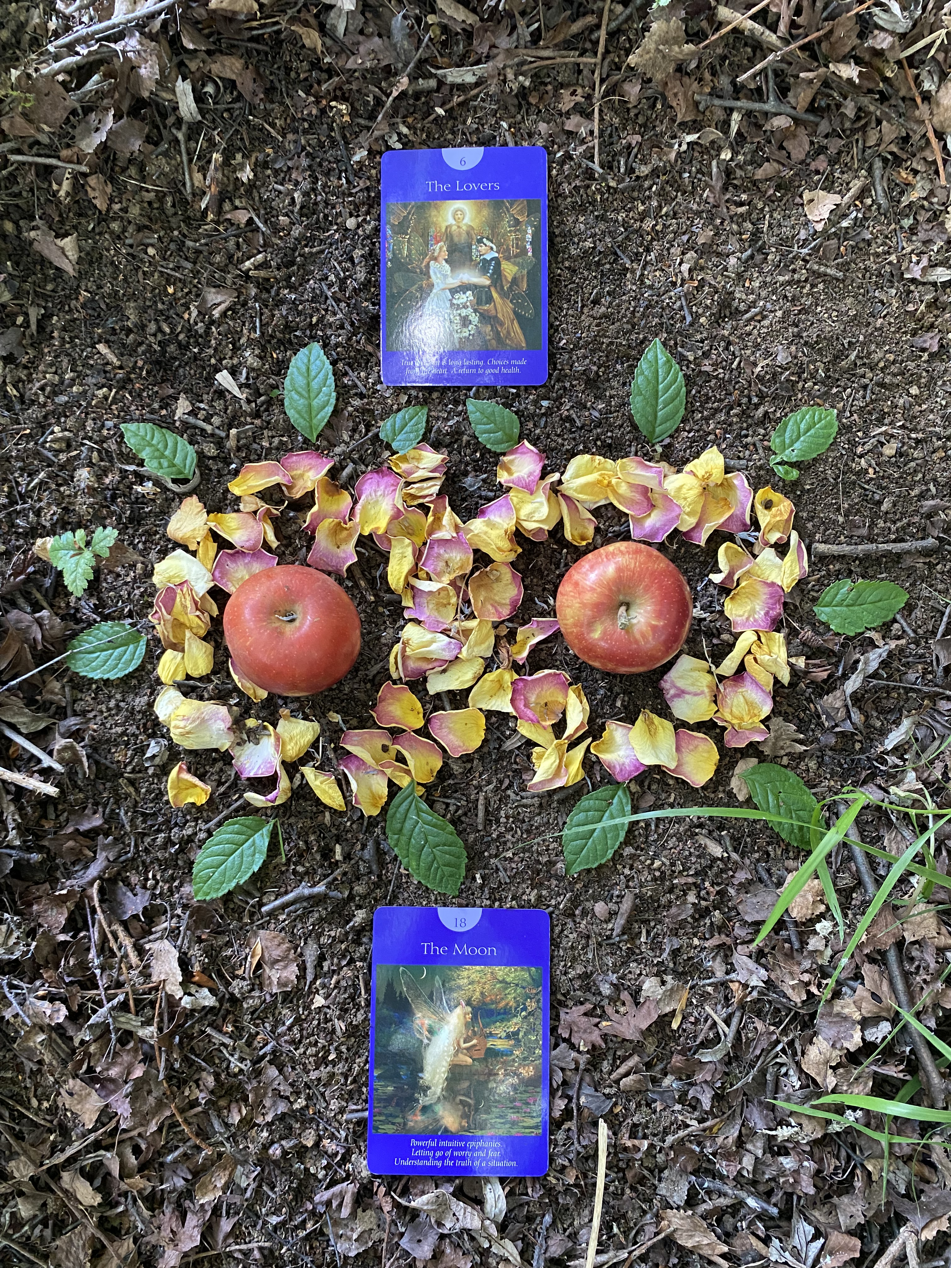 The natural mandala offering I created is of the infinity symbol. This came before I drew the cards and I hadn’t realised the Strawberry supermoon was upon us! You cannot see but one apple is quite old and wrinkly and the other fresh and crisp, symbolising that we must, at some point, let what is dying or dead go and at the same time enjoy the ripeness of this moment. This is a unifying of opposites. In grieving what is dead in our life we have to be careful not to kill what is still living and loving.