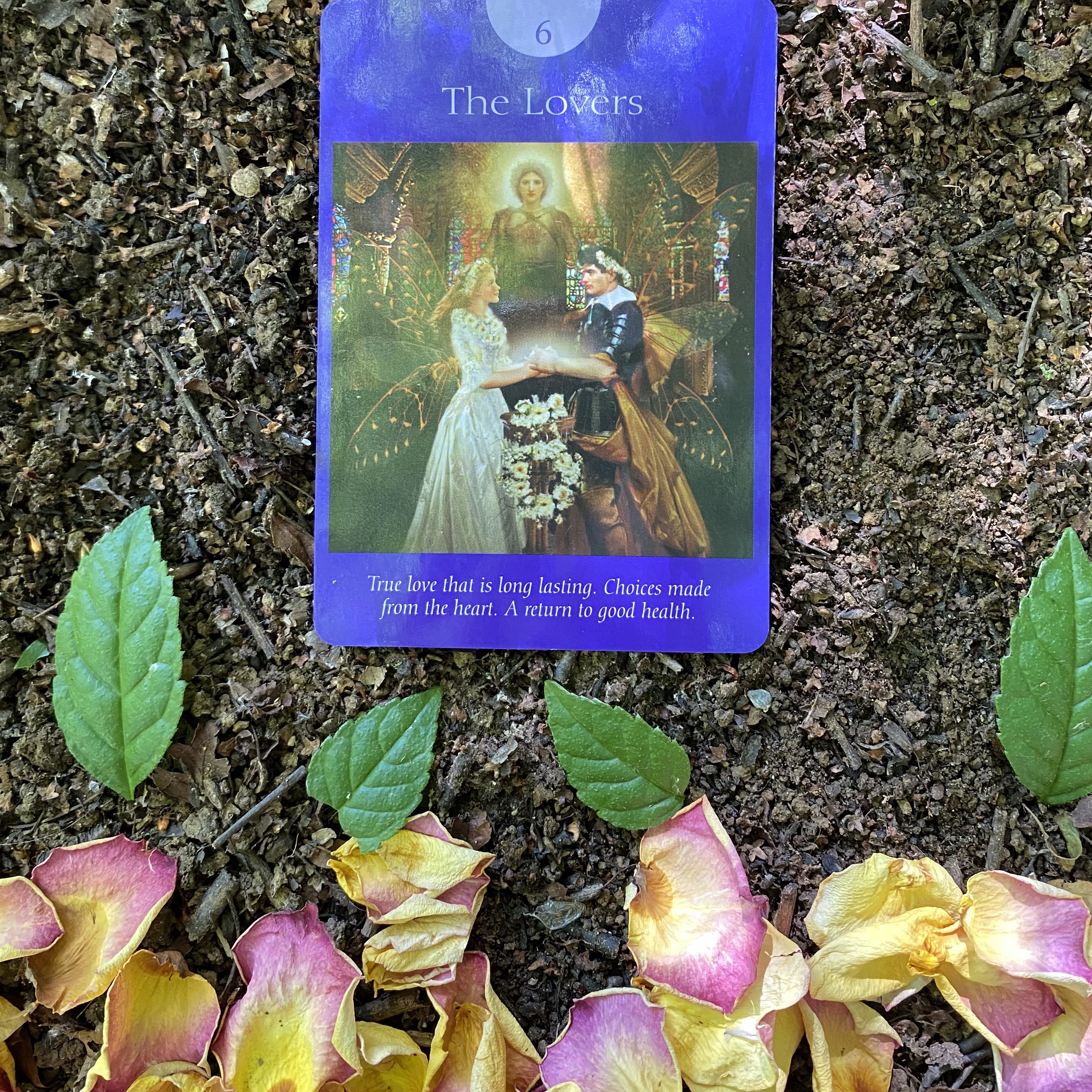 6 The Lovers On the surface this is a very positive card. The first image to leap out at me was the wreath of flowers. Love is blossoming, whether it is in relationship or someone learning to Love and integrate the masculine or feminine within themselves. The happy couple appear to be getting married, having made the choice to commit to each other in relationship.