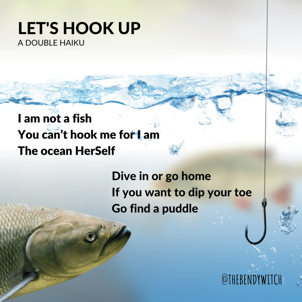 I am not a fish You can’t hook me for I am The ocean HerSelf Dive in or go home If you want to dip your toe Go find a puddle ©The Bendy Witch This double Haiku I’ve performed a couple times recently. It usually gets laughs, after the first line! I really do not like the expression, “Let’s hook up”. Who’s read The Celestine Prophecy? If you have then you know what I mean! It was the first “Spiritual” book gifted to me many many years ago and it’s really about energy power plays. I’ve been generally shit at spotting them. I have the gate of Innocence in my human design, in the not Self this has played out as inherent naïvety and the propensity to become easily disheartened in Love. One of the most challenging things in our evolution is to look within at our own power plays. Whether passive or aggressive, own them we must if we are to live a life of Truth. I confess to being “hooked” many a time throughout my life, until I started to see my own projections and decided I am not a fucking fish. I’m not willing to play that game anymore. All of us play our parts so we can help each other see more clearly where we are limiting ourSelves and outsourcing our Love. Projection of our ideals and someone’s potential is not reality. Astrologically Neptune has his way with us until we see (or become the sea 😆)! Waiting for someone to change is to be on a hook. Set yourSelf free and explore what it’s like to be the ocean. You change first by shifting your perception. If your person really wants to change they’ll put down the rod and learn to swim in your depths until they realise they too are the ocean. I’ve realised I’m not interested in or designed to be in super”fish”al relationships romantically or otherwise and that’s ok. I’ve realised I’m happier on my own rather than dangling on someones hook. Does that mean I want to be alone? No far from it. It does mean I will no longer compromise my mental health for a fantasy or the tasty bait of sweet promises. It means I’ve grown stronger in my sense of Self, my own self worth no longer dependent on being loved by another. This is what it means to be the ocean. To know you are the ocean of Love. To feel and let all your disappointments wash up on the shore. To keep coming back to your Self. To Love. I hope as a species we can evolve to be more open and honest in how we relate with each other. It will save a whole lot of heartache! Blessing all that forget they are the Ocean of Love, Blessing all waiting for the fishermen/women to put down their rods and dive in! Blessed Be. 🙏🏼♥️🧜🏼♂️