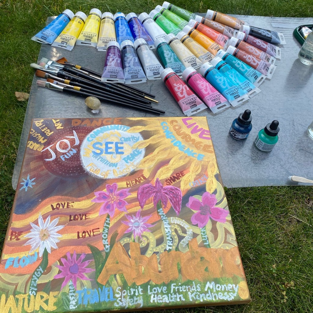 A friend has been taking me through an art Mandala making process. We started with layer 1 that represented the Earth. Layer 2 represented Flow. Layer 3 represented what we want (or at least think we want, lol) to bring into existence. It has been a few months since we did layer 3 and the painting has been sat in the front of my van and had many positive compliments of it. Someone even asked if they could take a picture of it.