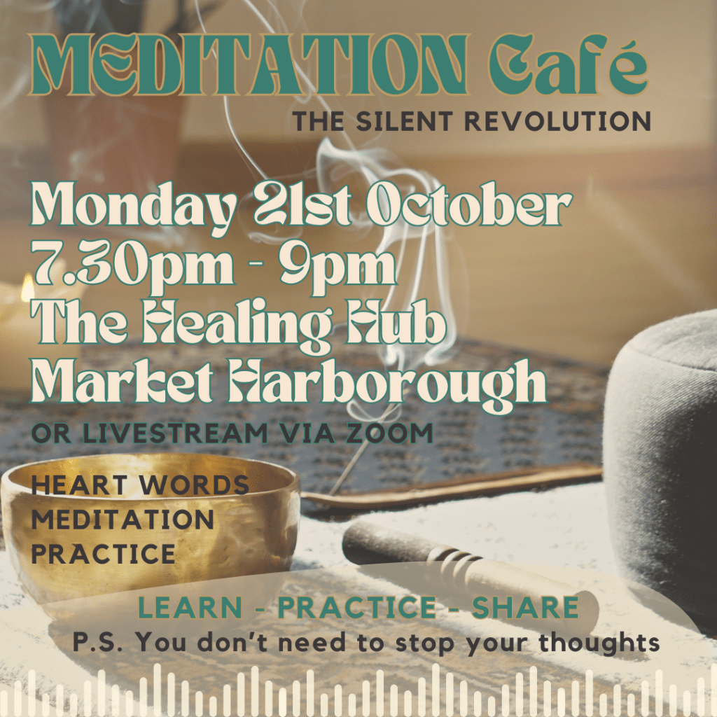 Tonight is our first Meditation cafe at The Healing Hub in Market Harborough. You can book here to join us in person (there is a minimum donation required) or join us via live-stream zoom as usual (donation optional).